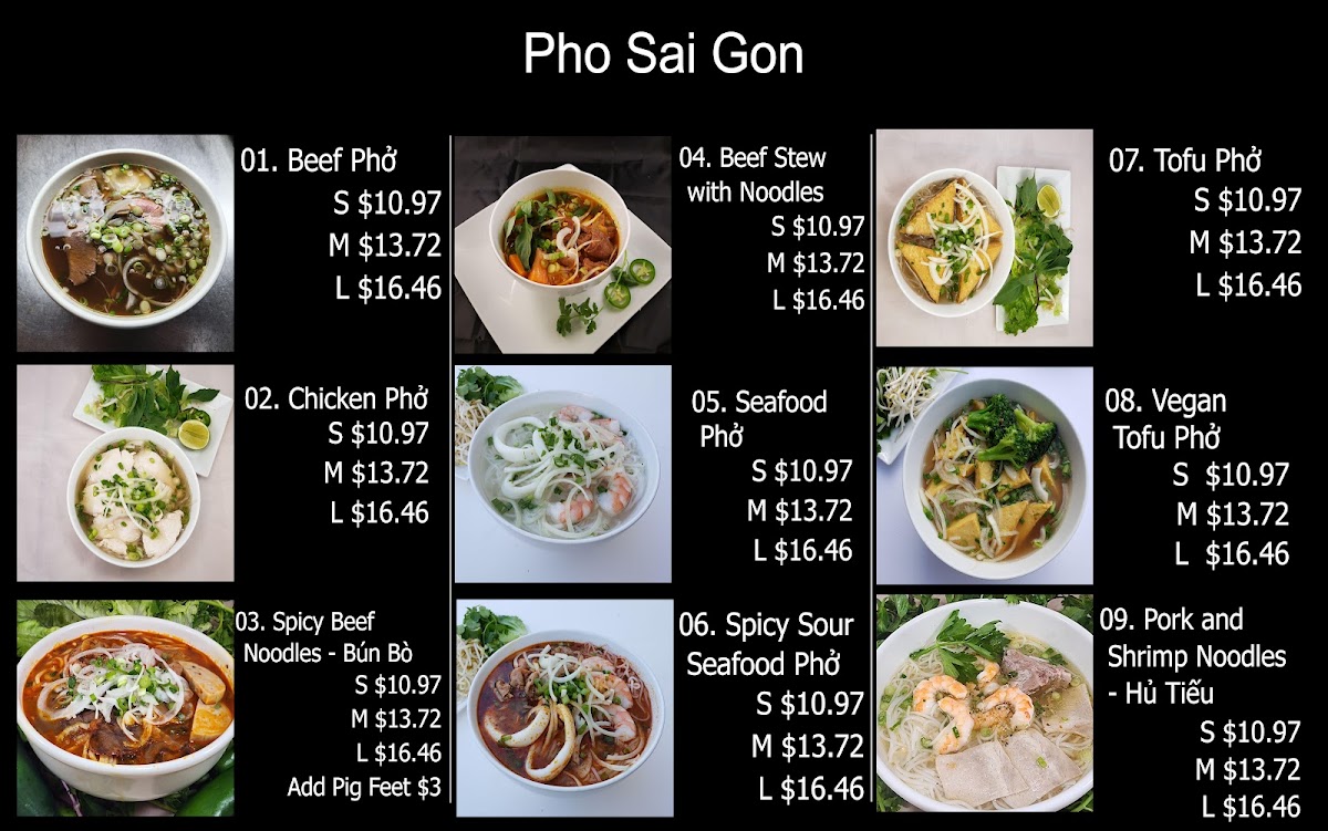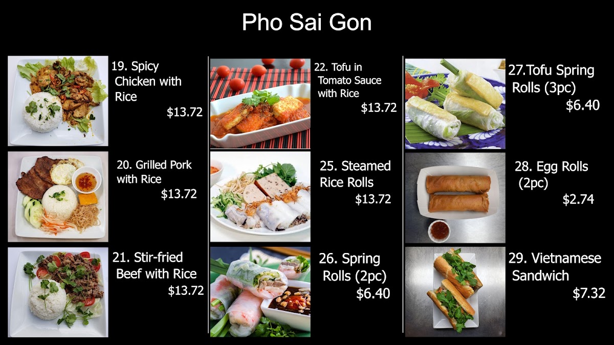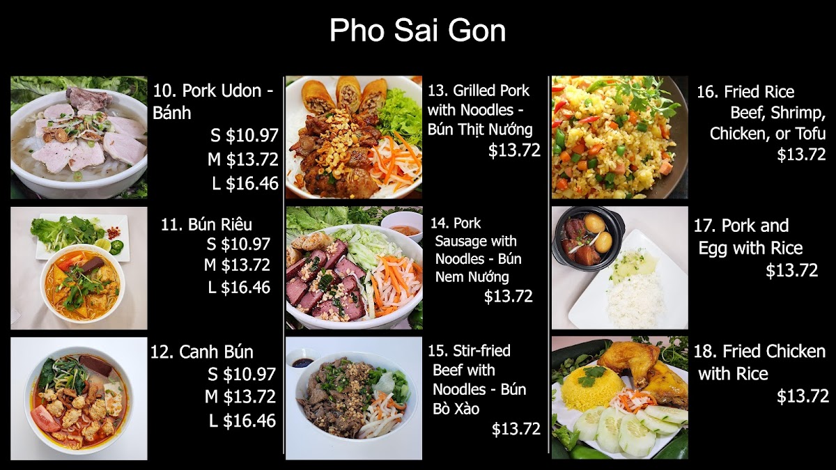 The menu at Pho Sai Gon offers a straightforward and inviting selection of Vietnamese dishes that feel right at home in a relaxed, casual setting. It’s the kind of place where you can enjoy comforting noodle soups like a rich Beef Pho or a spicy Bún Bò Huế any time of day—whether as a nourishing lunch or a soothing dinner. Simple yet flavorful options like Bánh Mì sandwiches, grilled pork with noodles, and fresh spring rolls provide satisfying bites that fit well with a laid-back meal or a quick, flavorful stop.