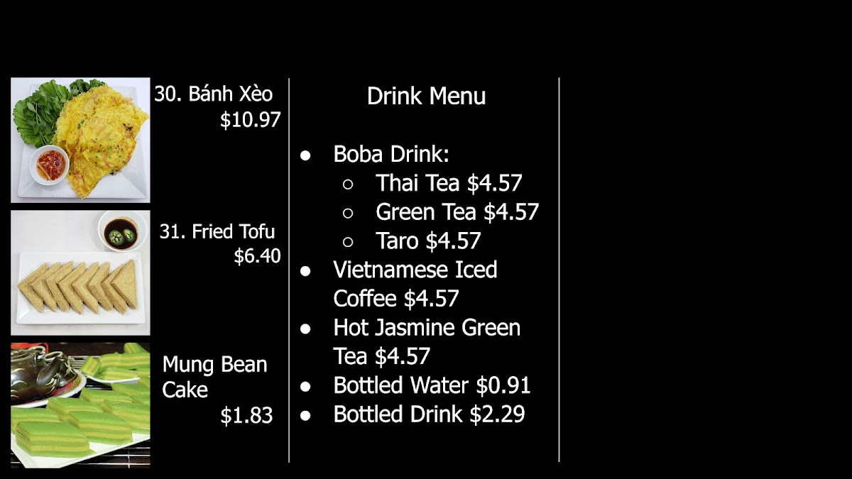 Alongside these traditional meals, the menu features a variety of drinks that complement the food and atmosphere, such as Vietnamese iced coffee—smooth and strong, perfect for a slow moment—or refreshing coconut water and boba tea for something a bit different. A condiment bar is thoughtfully set up, inviting diners to customize each dish with herbs, sauces, and fresh additions, enhancing the experience in a way that feels interactive and personal.